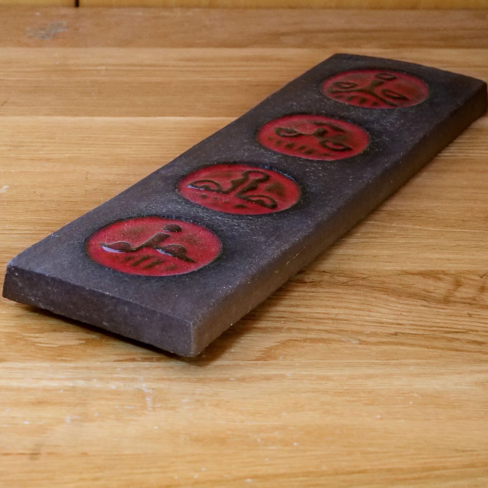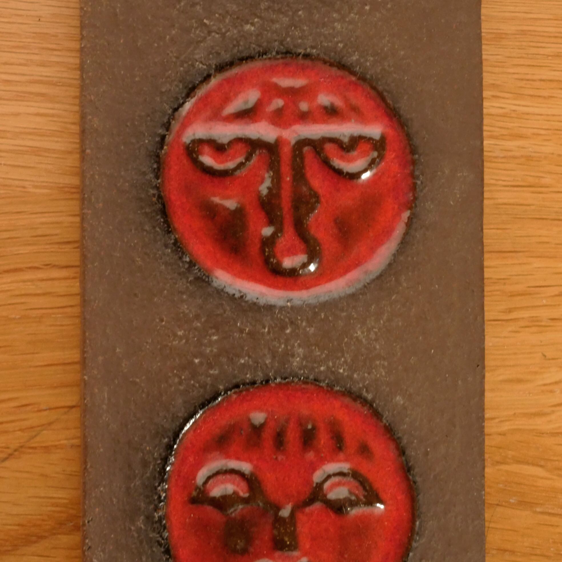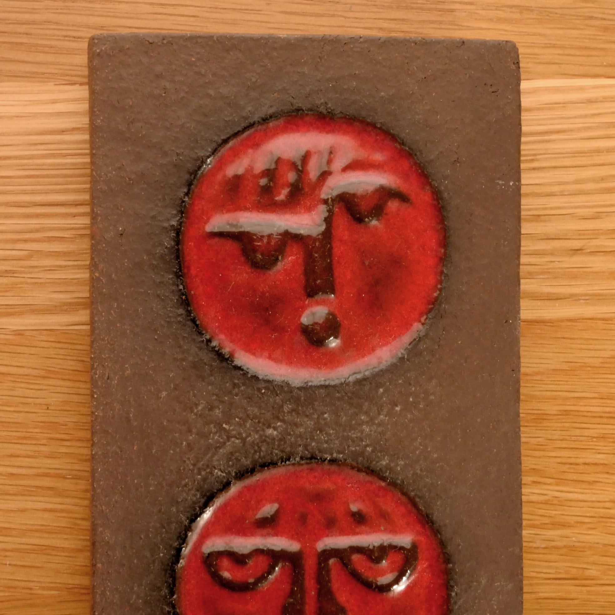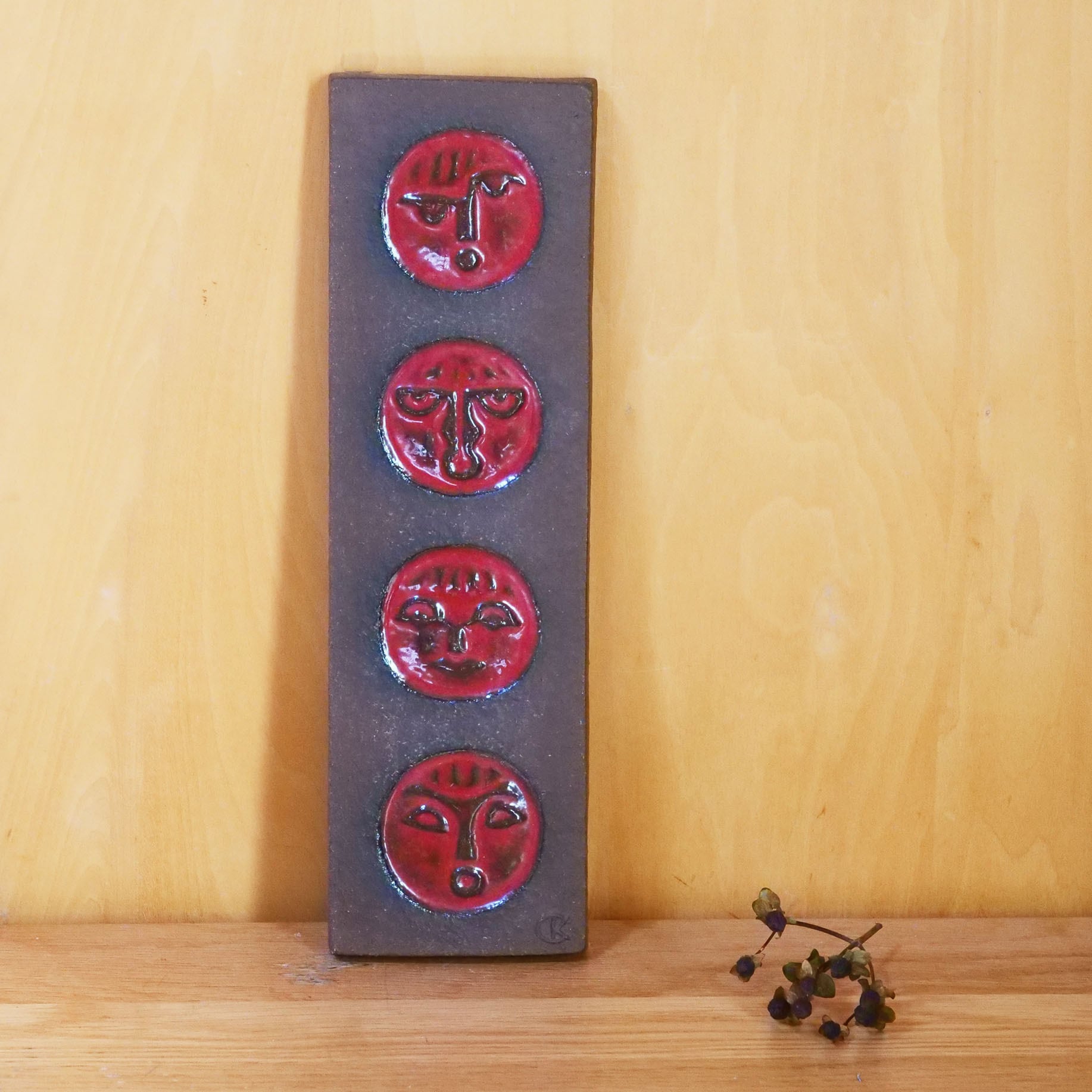 ダークブラウンの素地に、深みのあるレッドの釉薬で4つの異なる表情(顔)が描かれています。素朴ながらもどこかミステリアスで、北欧のヴィンテージらしい独特の雰囲気を持つアートピースです。